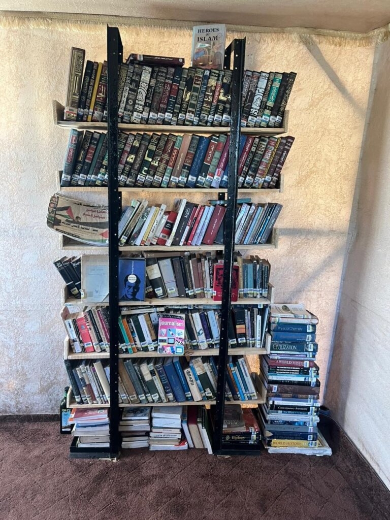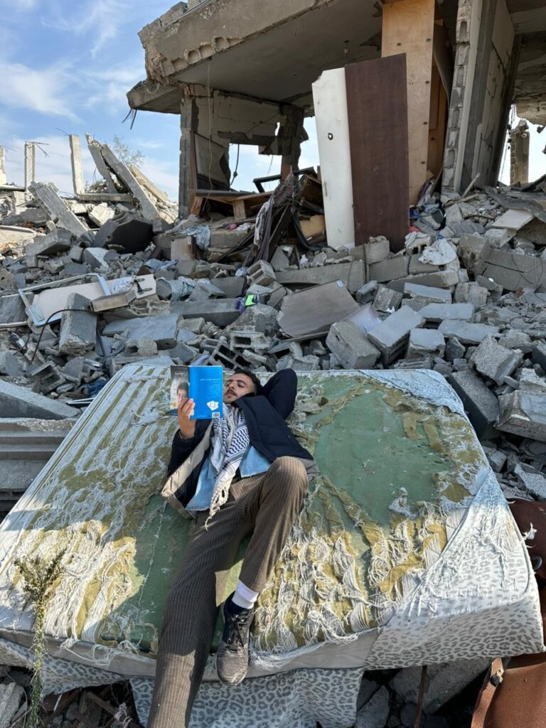 Ibrahim, parceiro de Omar no projeto, também sofreu perdas profundas. Sua casa foi completamente destruída, mas uma pequena estante se manteve de pé entre os escombros e se tornou um símbolo de resistência. “Vi meu pequeno armário lá no alto da pilha de pedras, com suas páginas respirando entre as pedras como se recusassem a morrer”.
